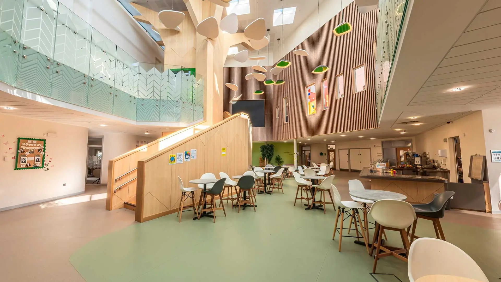 0:00Move through the different spaces to see classrooms, shared areas, and facilities used by students every day.