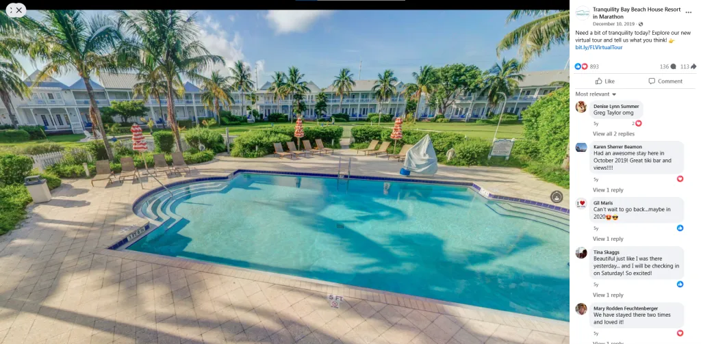 Tranquility Bay Beachfront Resort engaged The Virtual Tour Experts to amplify their online presence by creating a 360° social-media-ready virtual tour of their luxury resort in the Florida Keys. The project delivered high-quality aerial and interior 360° imagery tailored for Facebook 360° posts, drone visuals, and targeted ad campaigns. The content consistently achieved high engagement metrics, was repurposed across their marketing channels, and contributed significantly to online bookings and brand awareness.